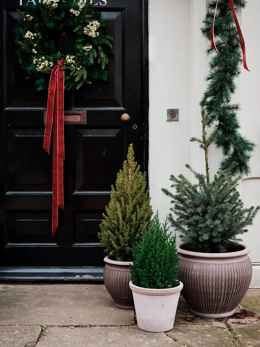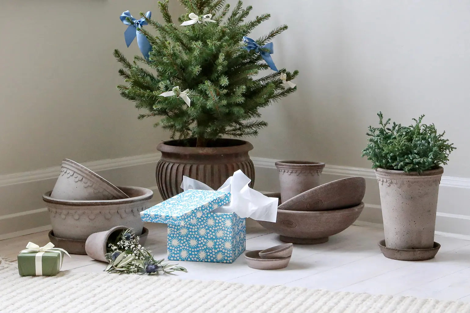 Ялини, розташовані в сірих теракотових горщиках, створюють природний спокій, передаючи суть зими та створюючи спокійну атмосферу у вашому просторі. Щоб додати елемент, який справді виділятиметься та створюватиме цілісну тему для ваших різдвяних прикрас, виберіть яскравий колір. Голубино-блакитний колір - відмінний вибір, який красиво доповнює сірі горщики.