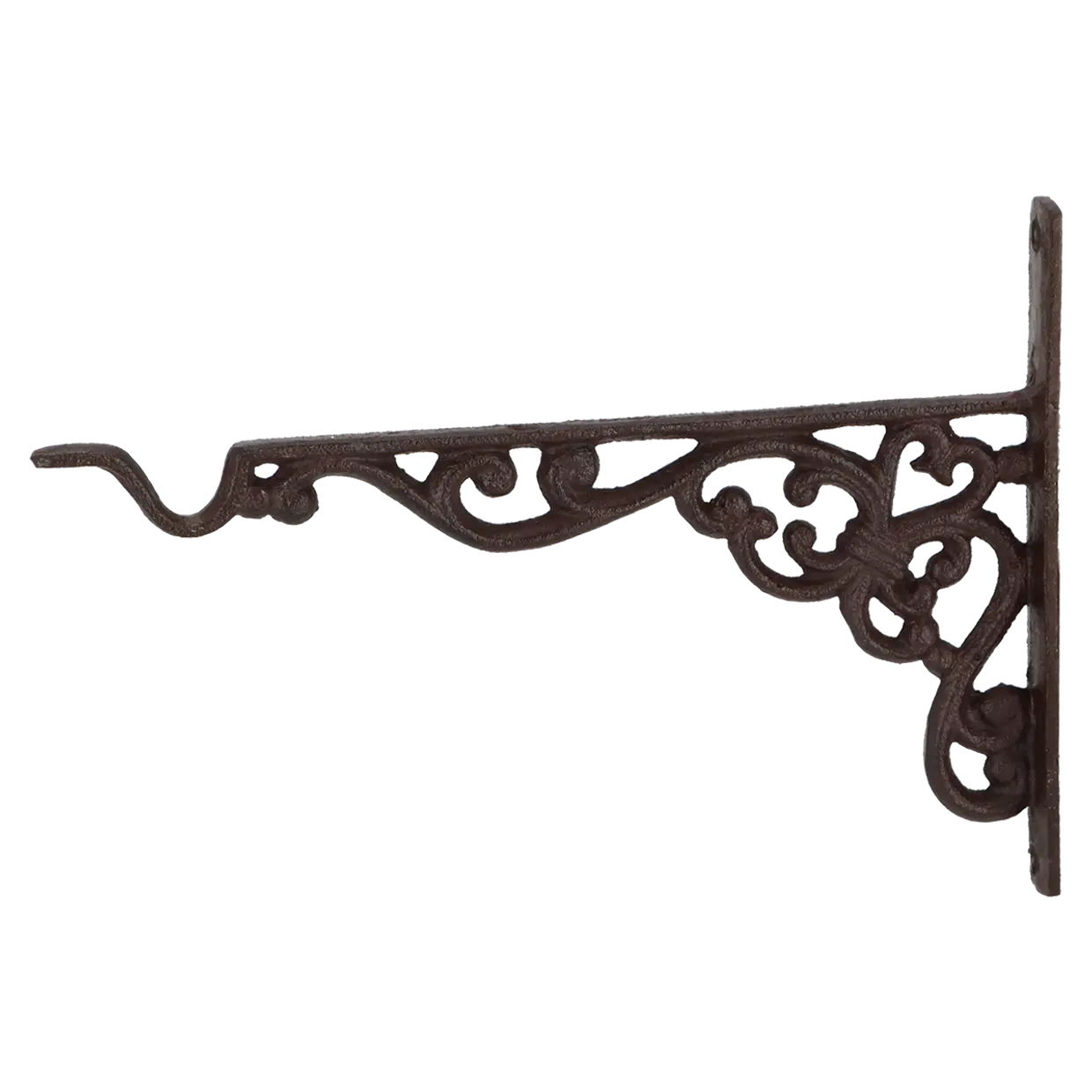 Гак виготовлений із міцного литого чавуну, що забезпечує довговічність та стійкість до навантаження. Підходить для підвісних кашпо діаметром до 30 см, а також для ліхтарів, декоративних підвісів або годівниць для птахів. Надійна настінна фіксація дозволяє безпечно використовувати його як у приміщенні, так і на відкритому повітрі.