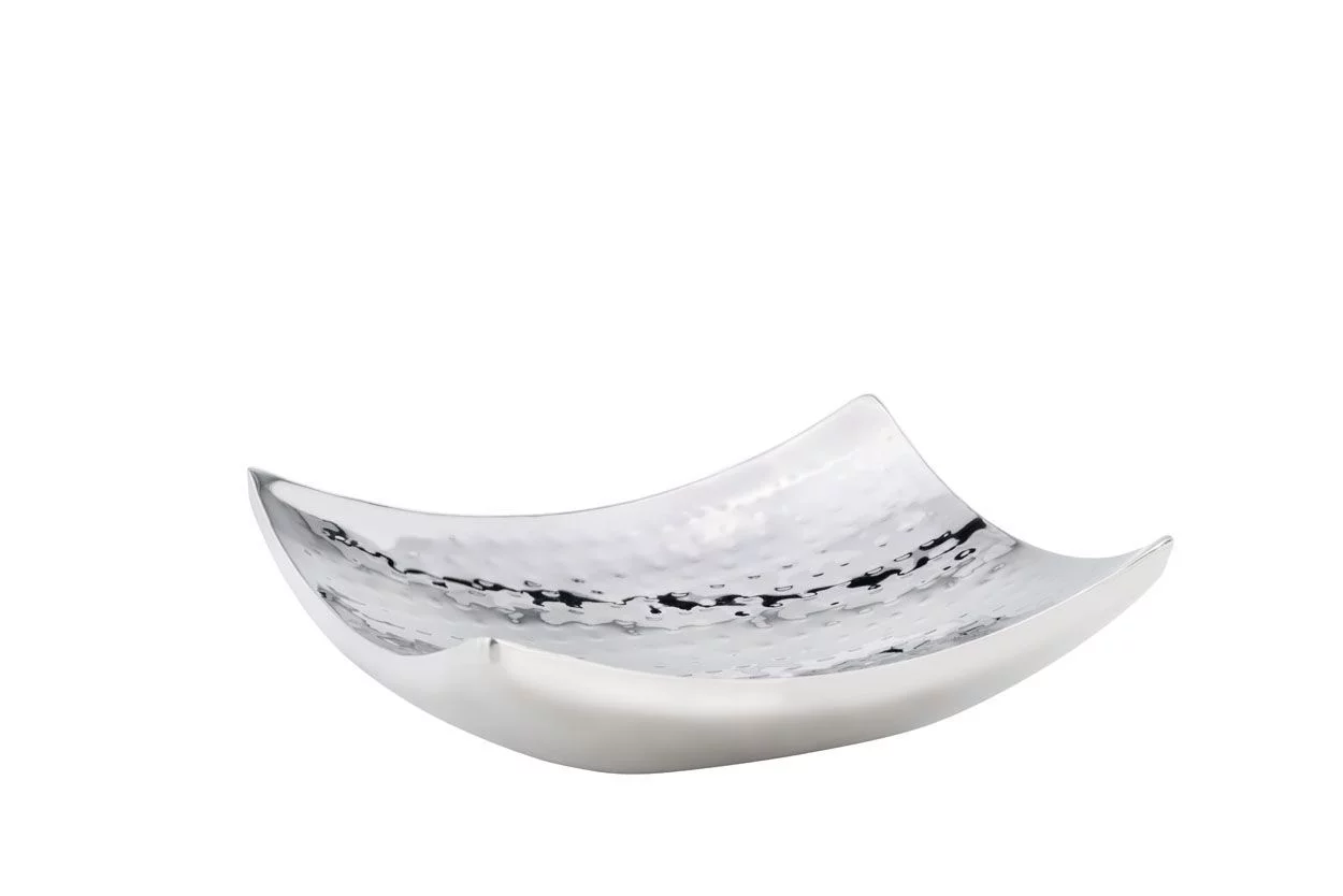 Сучасне квадратне блюдо з нержавіючої сталі з ефектною молотковою фактурою стане ідеальною основою для подачі фруктів, канапе, десертів або створення декоративних композицій. Блискуча поверхня та виразний дизайн роблять його універсальним елементом столового декору.