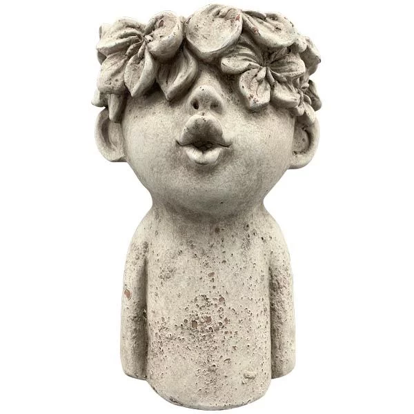 Оригінальне декоративне кашпо у вигляді милого дитячого обличчя з квітами у волоссі стане незабутнім акцентом у вашому інтер'єрі чи саду. Виконане з цементу у стилі StoneArt, поєднує скульптурну естетику з функціональністю. Ідеальне для розміщення кімнатних рослин, квітів або як самостійний елемент декору.