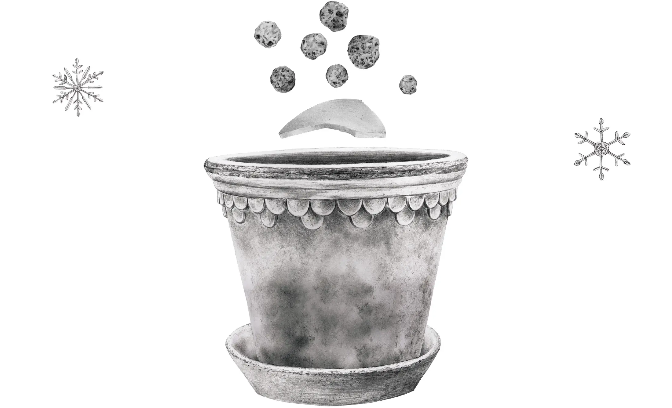 Дуже важливо переконатися, що горщик добре стікає, а отвір у дні не засмічується. Якщо отвір заблоковано, вода накопичуватиметься, і коли температура опуститься нижче 0°C, вода замерзне, спричиняючи її розширення, що може пошкодити горщик