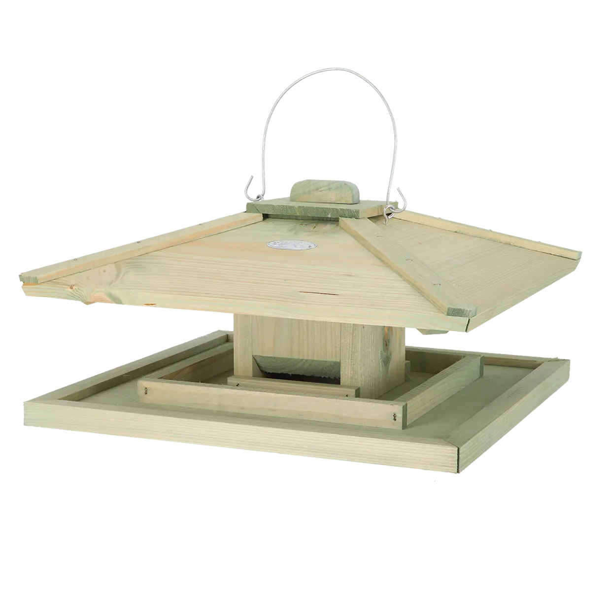 Відкрита конструкція дозволяє птахам зручно підлітати з різних боків і сідати на лоток для корму. Завдяки центральному силосу корм подається поступово, що забезпечує достатній запас на цілий день без постійного досипання. Великий дах захищає зерно від дощу та снігу, зберігаючи його сухим.
