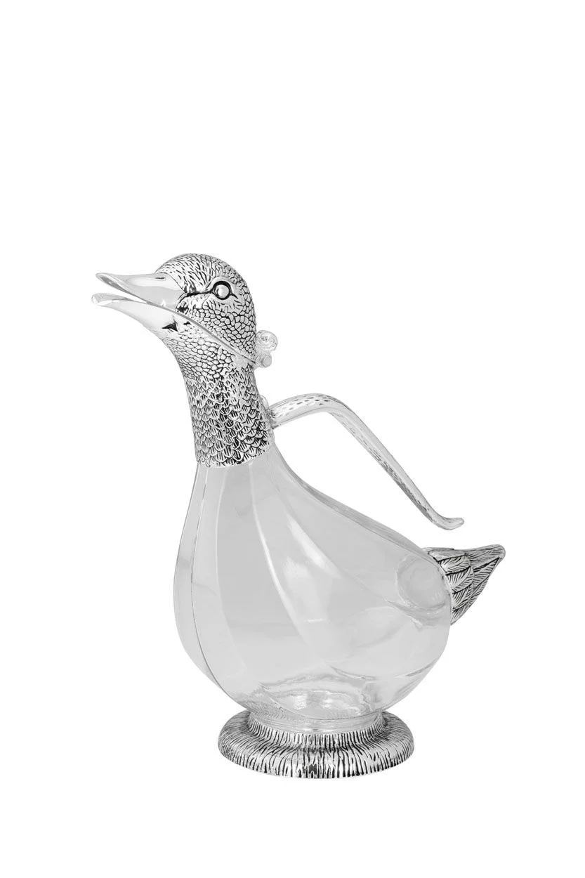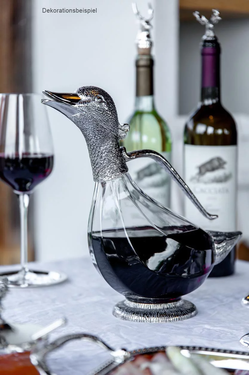 Елегантний графин у формі качки створений для тих, хто цінує поєднання вишуканого дизайну та практичності. Скляний корпус із деталями з посрібленим покриттям робить його не лише функціональним аксесуаром для сервірування вина, а й справжньою прикрасою святкового столу.