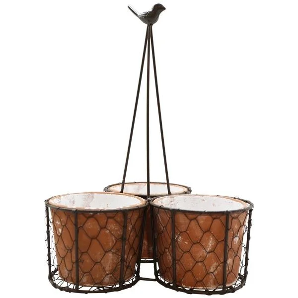 Поєднання натуральної кераміки та металевого каркасу надає виробу сучасного вигляду, а декоративна пташка зверху додає особливого шарму. Завдяки стійкій конструкції кашпо зручно розміщується на підлозі, столі або підвіконні.