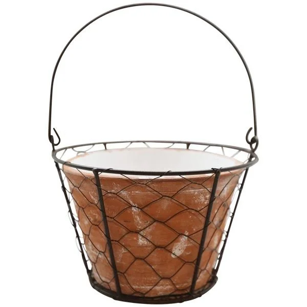Керамічний горщик у теплому теракотовому відтінку гармонійно поєднується з металевою сіткою, яка не лише прикрашає виріб, а й забезпечує додаткову міцність. Завдяки зручній металевій ручці кашпо можна як розмістити на поверхні, так і підвісити за потреби.