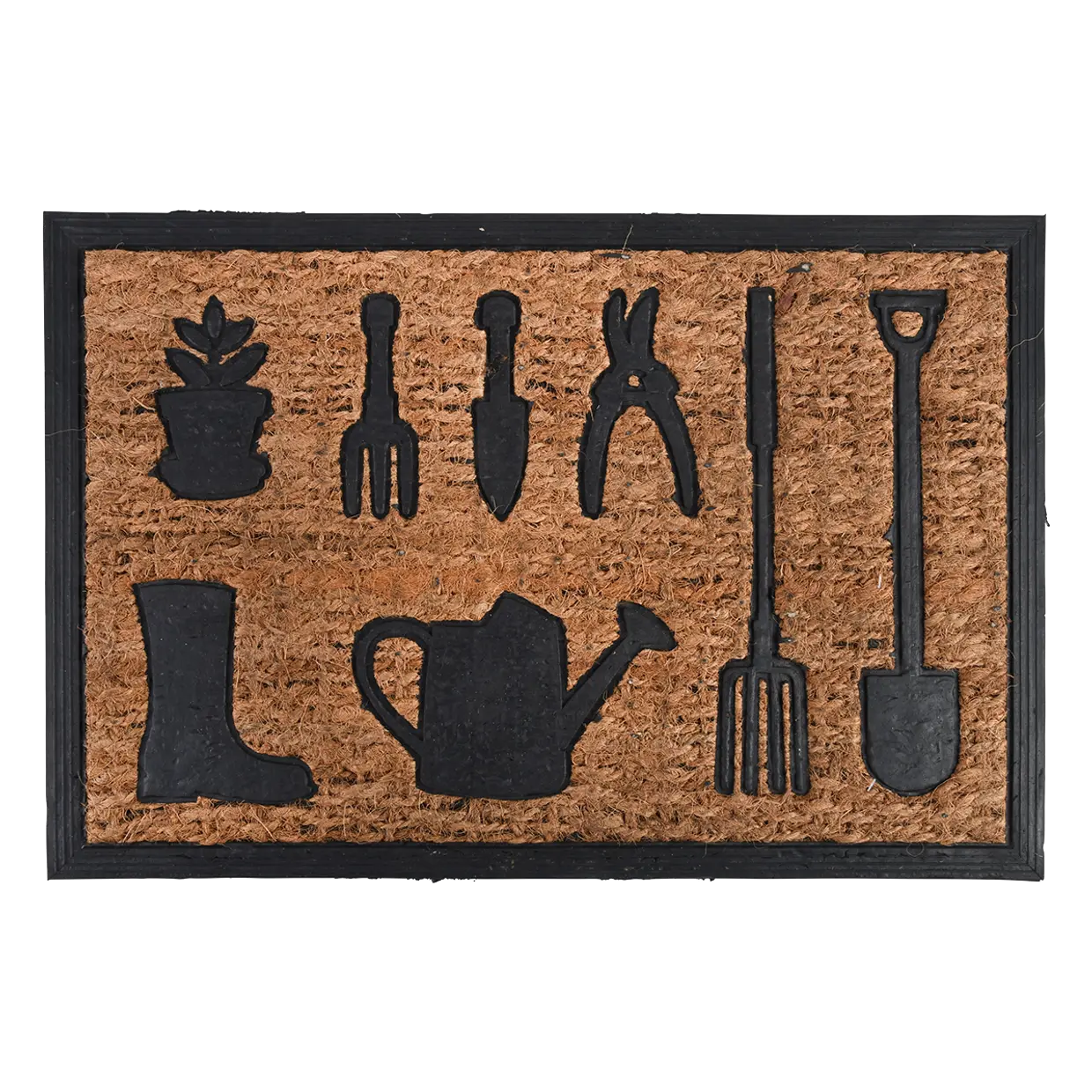 Практичний і стильний придверний килимок із натурального кокосового волокна в чорній гумовій рамці стане чудовим доповненням входу до будинку або садової тераси. Декоративний дизайн із силуетами садових інструментів додає виробу характеру та підкреслює любов до садівництва.
