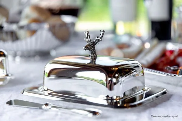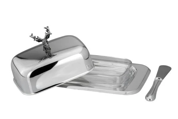 Вишукана срібляста маслянка з ефектною фігуркою оленя стане яскравою деталлю сервірування сніданку чи святкового столу. Завдяки збільшеному розміру підходить для половинки стандартної пачки масла, а скляна вставка забезпечує гігієнічність та легке очищення. Ніж у комплекті додає зручності в користуванні.