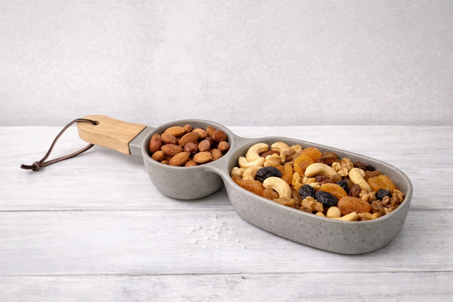 Стильна менажниця з двома відділеннями — ідеальне рішення для подачі закусок, горіхів, сухофруктів або соусів. Завдяки поділу на секції можна красиво поєднувати різні продукти, створюючи естетичну та зручну подачу.