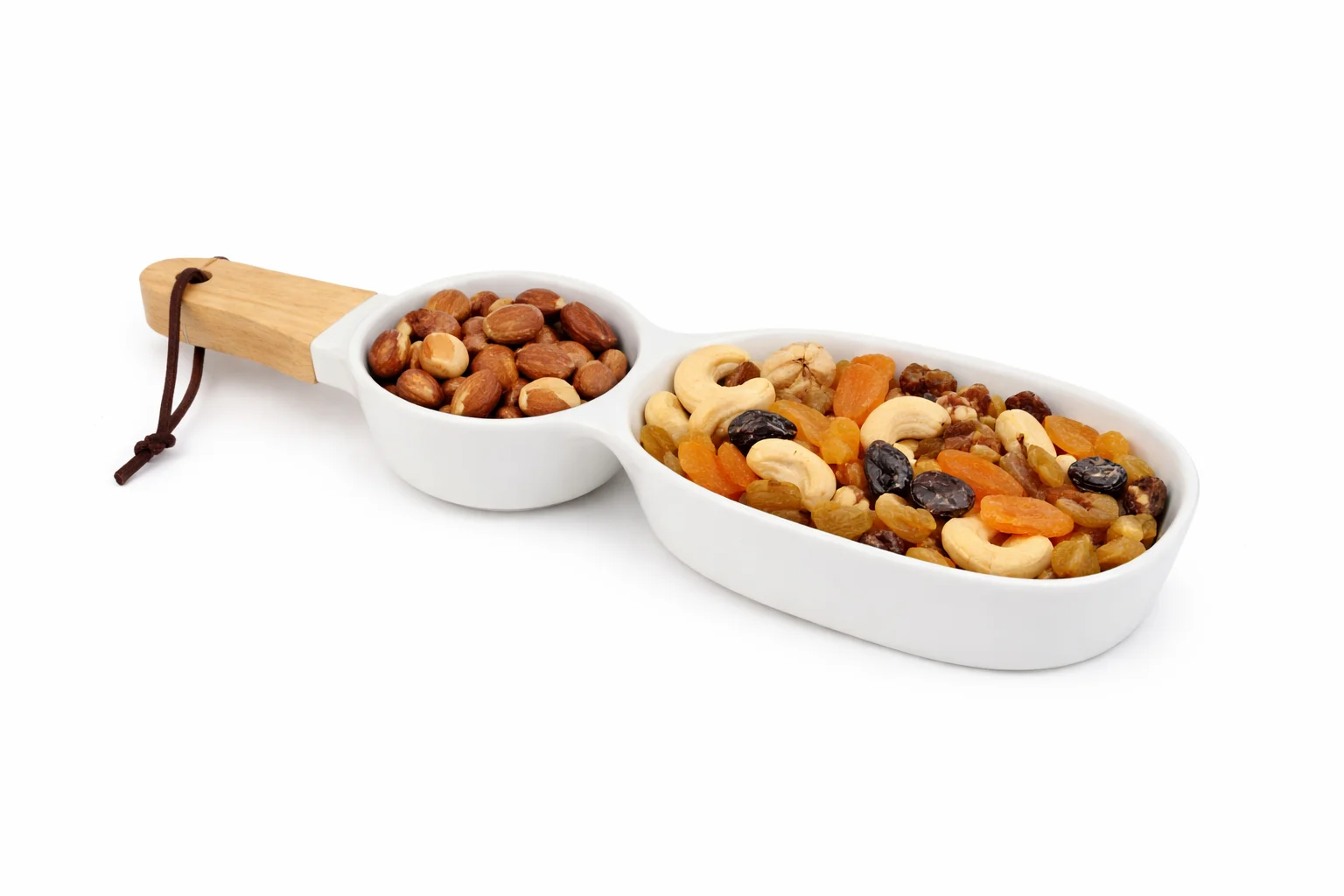 Елегантна менажниця з двома відділеннями — практичне рішення для подачі закусок, горіхів, соусів або десертів. Завдяки продуманій формі ви можете зручно поєднувати різні продукти, не змішуючи їх між собою.