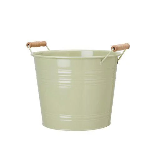 Металеве кашпо ARIELLA у ніжному зеленому відтінку — стильне рішення для оформлення тераси, балкона або інтер’єру. Лаконічна конічна форма доповнена декоративними горизонтальними лініями та ручками з дерев’яними вставками, що додає виробу затишного, скандинавського характеру.