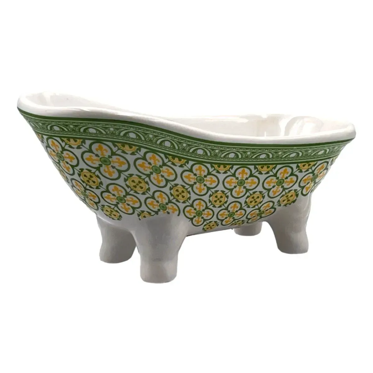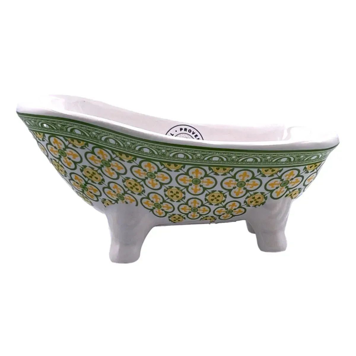 Керамічна мильниця в формі ванни. Колір білий з зеленим і жовтим декоративним орнаментом - геральдична лілія з зовнішньої сторони.
