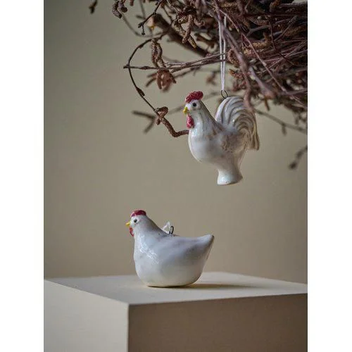 Чарівний комплект керамічних підвісок — це ніжний декоративний акцент для дому. У набір входять дві фігурки: курочка та півник у білому кольорі з делікатними кольоровими деталями.