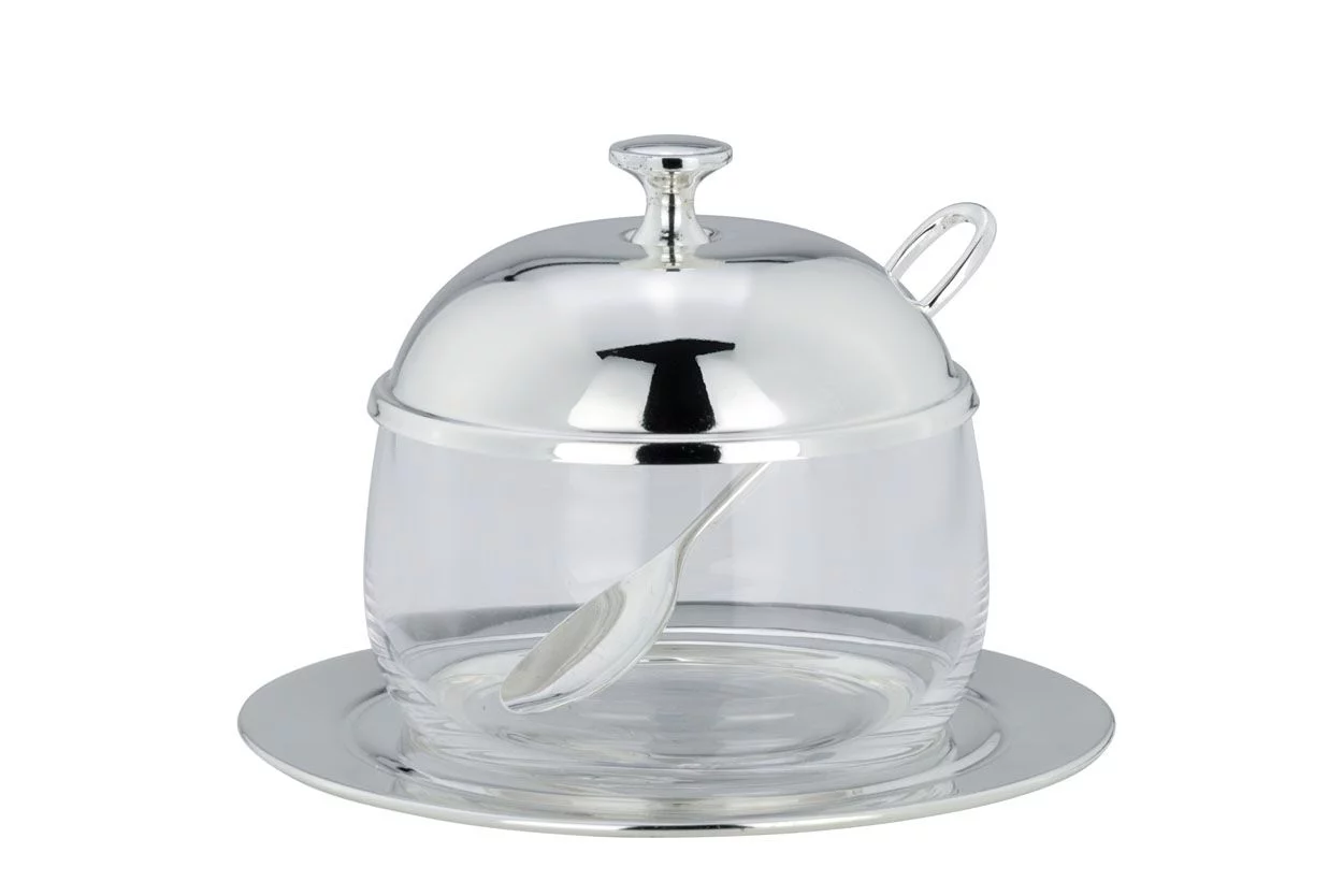 Стильний набір для подачі варення або меду, що поєднує практичність і вишуканий дизайн. Скляна ємність зі знімною кришкою та ложечкою доповнена підставкою зі срібним покриттям, завдяки чому набір виглядає елегантно на будь-якому столі.