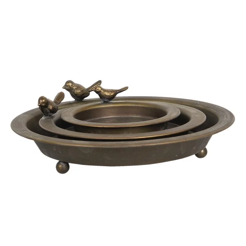 Набір купалень для пташок із трьох металевих мисочок у класичному стилі стане справжньою окрасою вашого саду чи тераси. Завдяки різним розмірам (Ø30x9 см, Ø22x7 см та Ø16x5 см) вони створюють затишний простір для купання та пиття пташок, приваблюючи їх і додаючи вашому двору живої атмосфери. Стильний дизайн із декоративними пташками на краях робить цей набір не лише практичним, а й витонченим елементом декору.