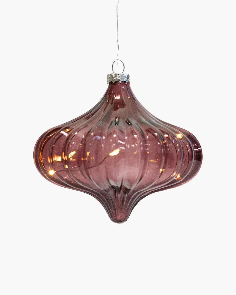 Новорічна прикраса Dina виготовлена з тонкого кольорового скла.Має оригінальний дизайн з LED-підсвіткою.Нею можна прикрасити не тільки ялинку, але й гірлянду або в якості декору інтер'єру за власним бажанням.Має живлення від батарейки.