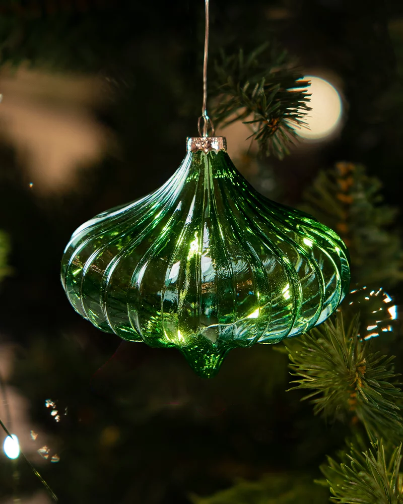 Новорічна прикраса Dina виготовлена з тонкого кольорового скла.Має оригінальний дизайн з LED-підсвіткою.Нею можна прикрасити не тільки ялинку, але й гірлянду або в якості декору інтер'єру за власним бажанням.Має живлення від батарейки.
