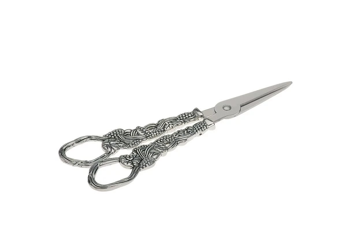 Вишукані декоративні ножиці, оздоблені деталізованим виноградним орнаментом. Завдяки елегантному дизайну та срібленому покриттю вони стануть стильним і практичним аксесуаром для сервірування столу. Чудово підходять для нарізання тонких продуктів, прикрас чи як витончений акцент у вашій колекції кухонних аксесуарів.