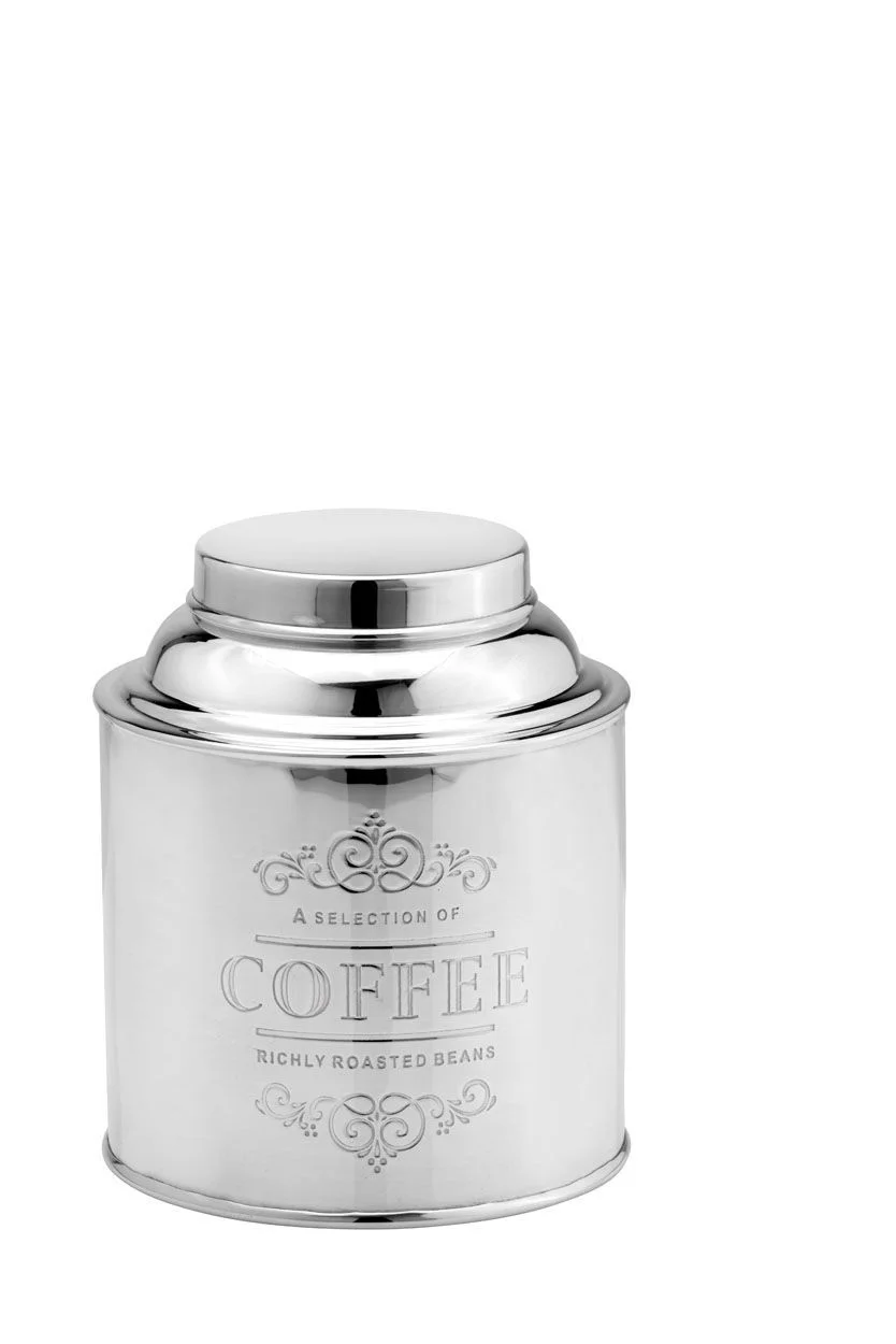 Кругла банка для кави з посрібленою поверхнею — аксесуар, що додасть сервіруванню нотки класичної розкоші.