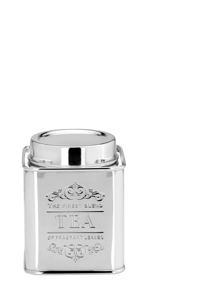 Квадратна банка для чаю з посрібленим покриттям та декоративним гравіюванням “TEA – Finest Blend”.