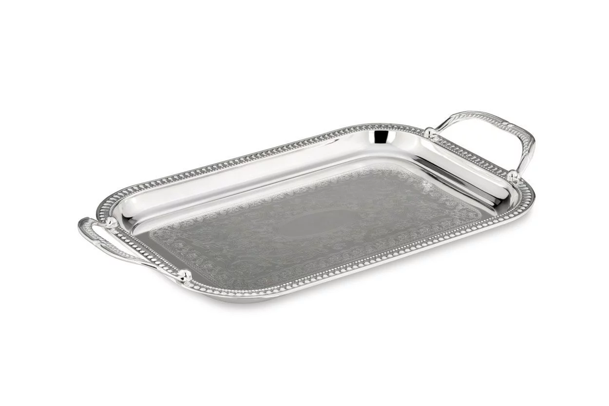 Цей стильний піднос з орнаментованою поверхнею та зручними ручками стане незамінним елементом сервірування у домі, ресторані чи на святковому заході. Блискуча срібляста обробка додає вишуканості та створює преміальну атмосферу під час подачі напоїв, тістечок чи закусок.