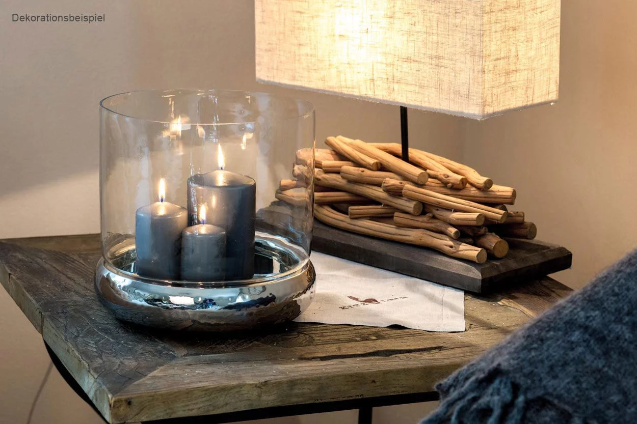 Стильний ліхтар-підсвічник з ударною (hammered) текстурою основи — акцентний елемент, що приносить у простір сучасний блиск та об’єм. Прозоре циліндричне скло делікатно посилює сяйво свічки й захищає полум’я від протягів.