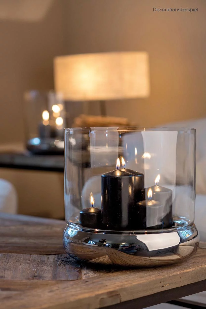Елегантний скляний підсвічник-ліхтар на масивній основі з полірованої нержавіючої сталі — стильний акцент для будь-якого інтер’єру. Висока циліндрична колба надійно захищає полум’я, створюючи м’яке затишне сяйво як у приміщенні, так і на терасі.