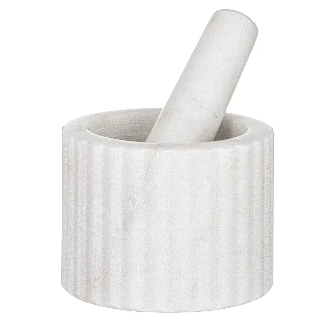 Елегантна мармурова ступка з товкачем — ідеальний інструмент для приготування спецій, соусів і паст. Виготовлена з натурального білого мармуру, кожна одиниця має унікальний природний малюнок, що робить її не лише практичним аксесуаром, а й стильним елементом кухні.