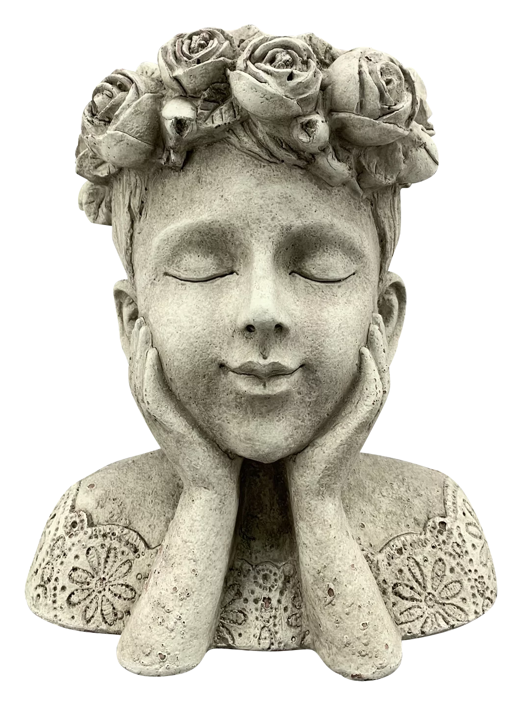 Декоративне кашпо у формі жіночої голови з вінком троянд — витончений акцент для саду або інтер’єру. Виконане з цементу у стилі StoneArt, воно поєднує функціональність і скульптурну естетику. Може використовуватись як самостійна прикраса або як оригінальне кашпо для рослин.
