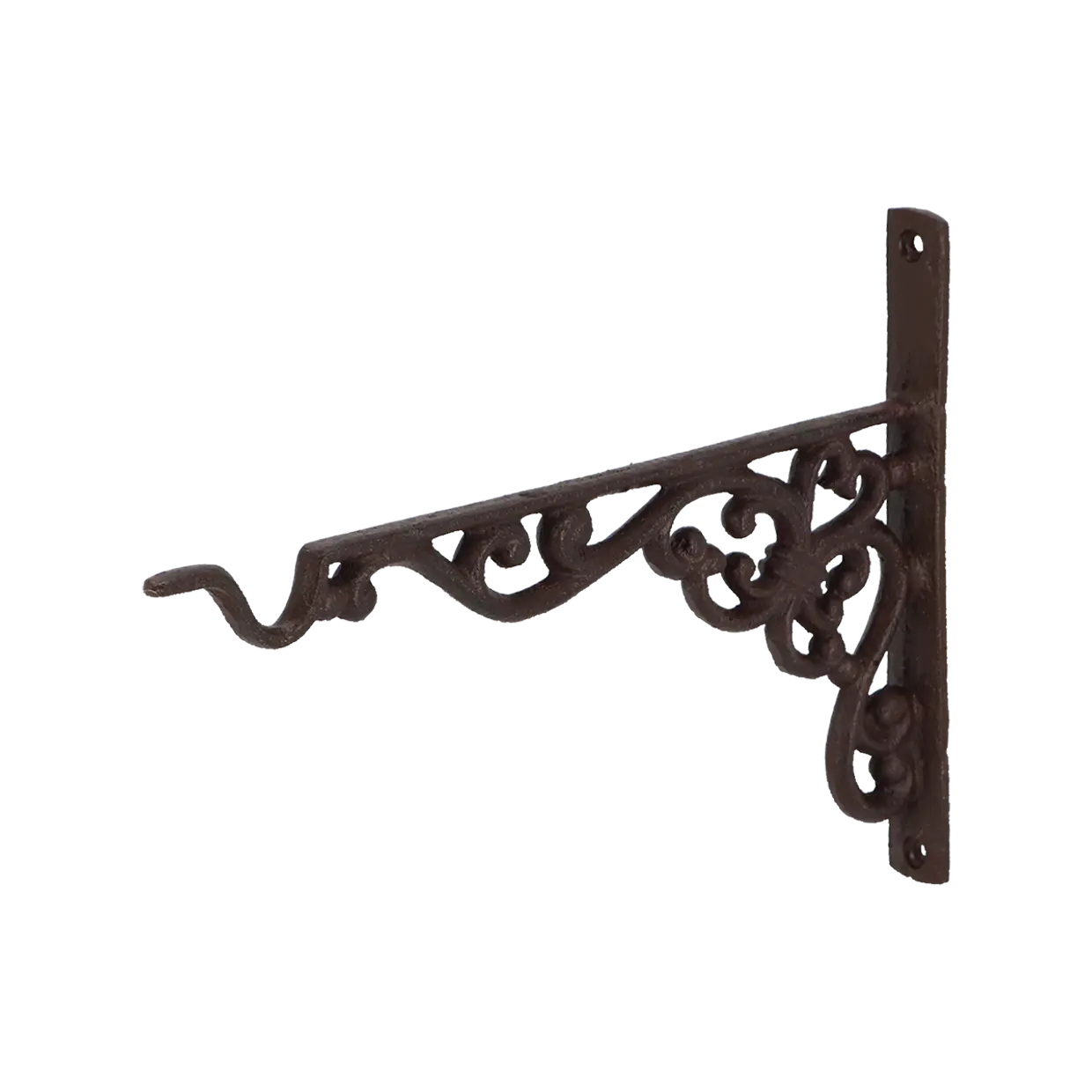 Гак виготовлений із міцного литого чавуну, що забезпечує довговічність та стійкість до навантаження. Підходить для підвісних кашпо діаметром до 30 см, а також для ліхтарів, декоративних підвісів або годівниць для птахів. Надійна настінна фіксація дозволяє безпечно використовувати його як у приміщенні, так і на відкритому повітрі.
