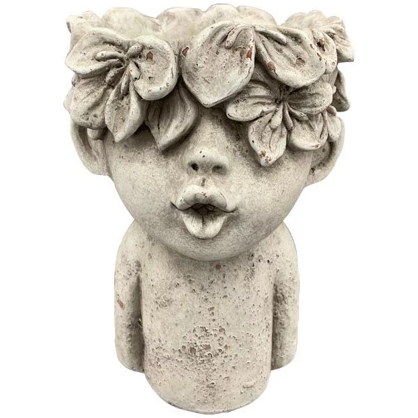 Оригінальне декоративне кашпо у вигляді милого дитячого обличчя з квітами у волоссі стане незабутнім акцентом у вашому інтер'єрі чи саду. Виконане з цементу у стилі StoneArt, поєднує скульптурну естетику з функціональністю. Ідеальне для розміщення кімнатних рослин, квітів або як самостійний елемент декору.