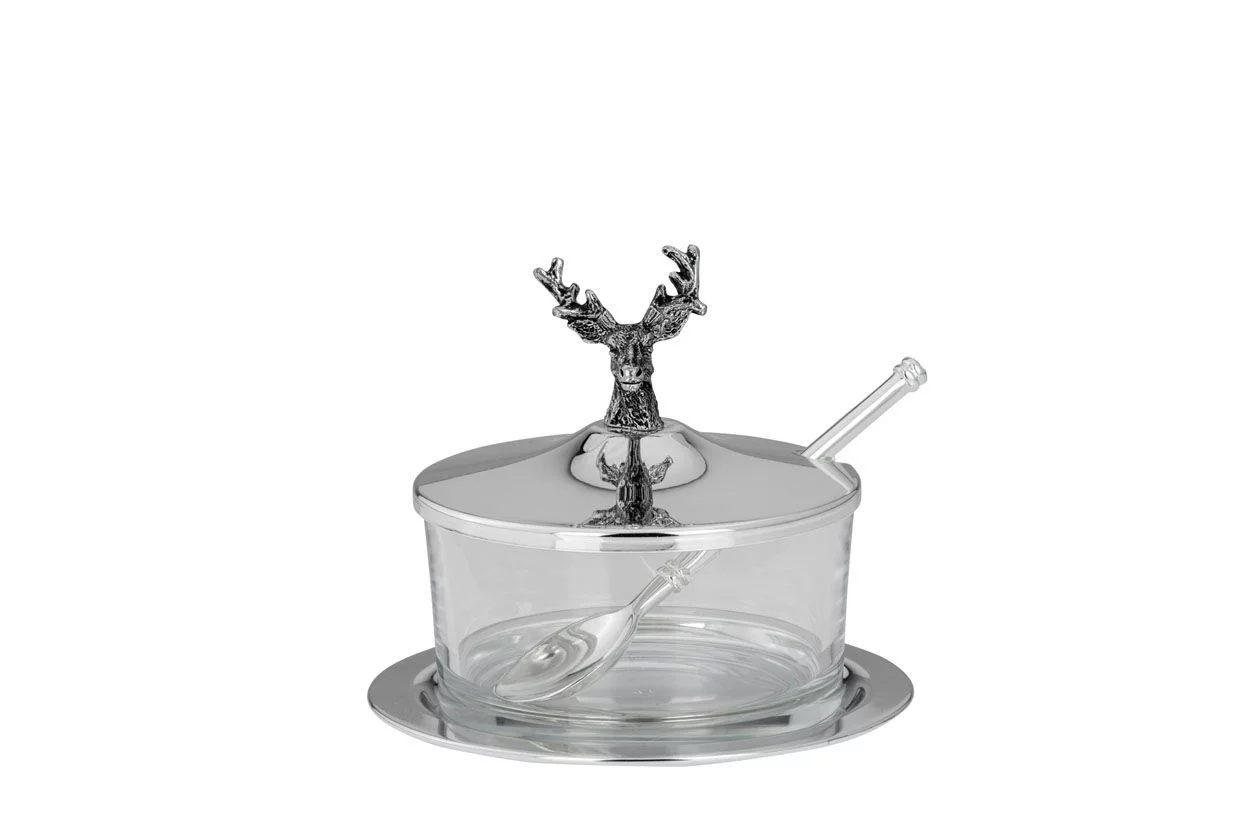 Елегантна посудина для подачі пармезану, меду, варення чи соусів стане вишуканим акцентом на вашому столі. Поєднання прозорого скла та срібного блиску створює преміальну атмосферу, а декоративний олень на кришці додає особливого зимового шарму.