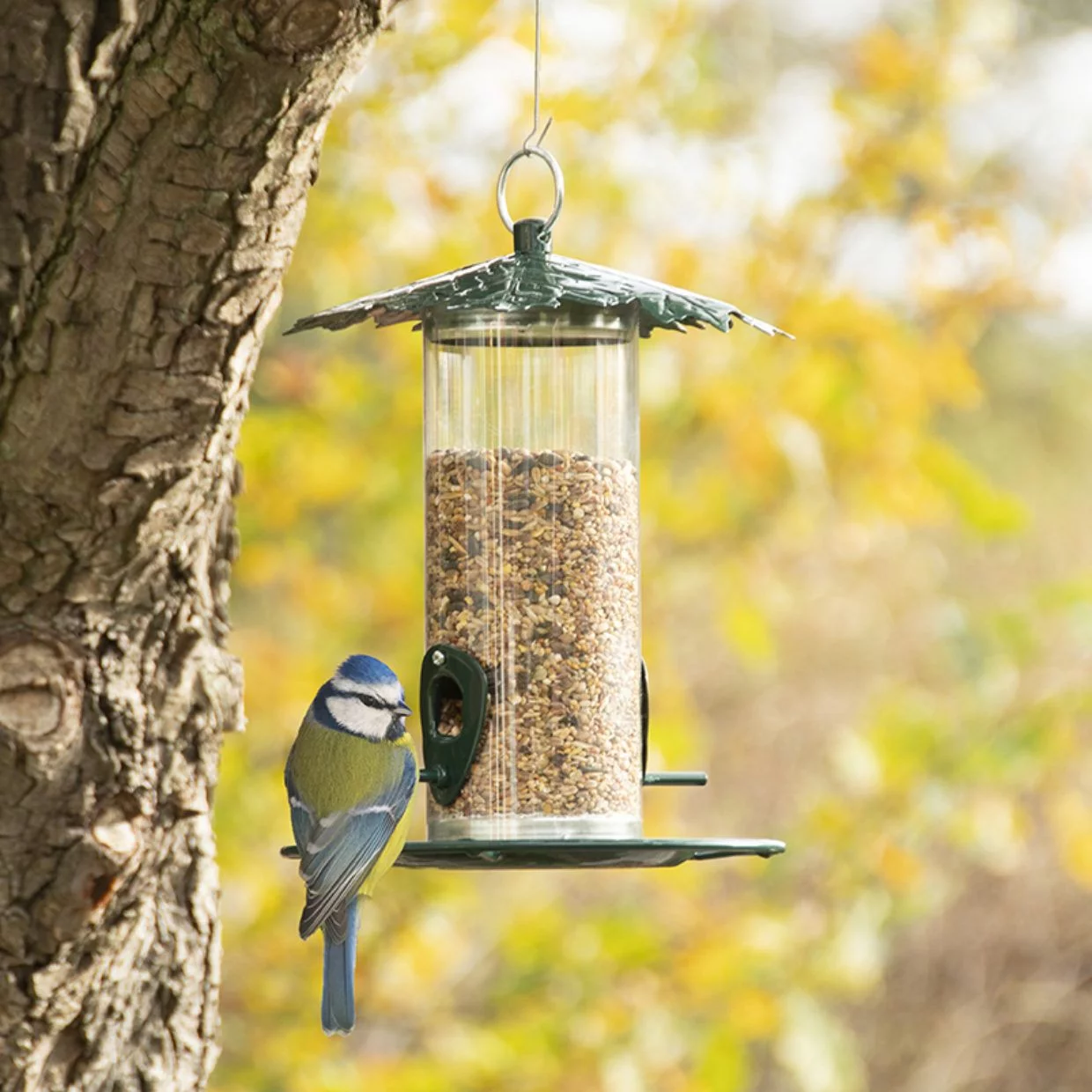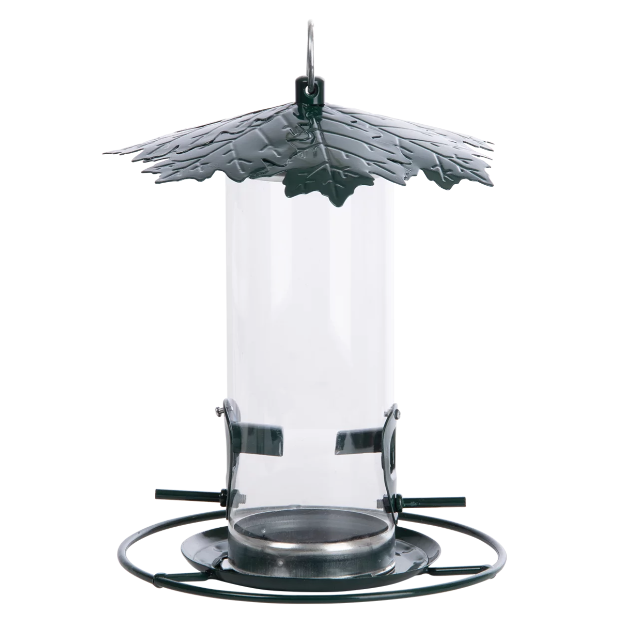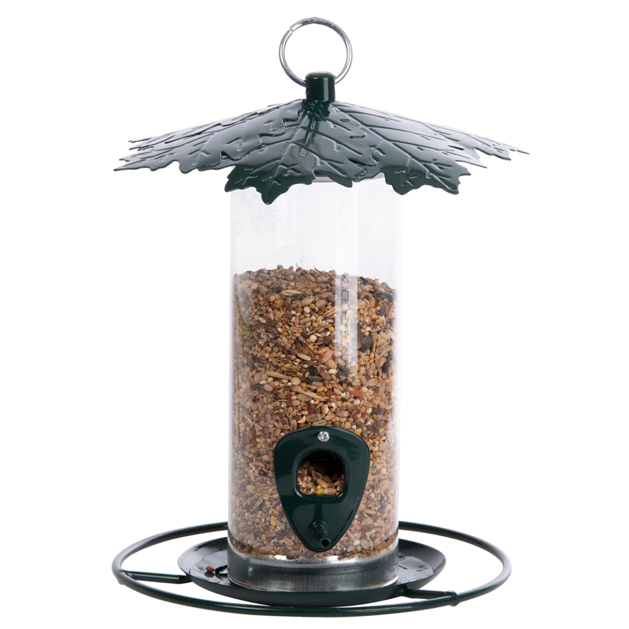 Стильне та практичне рішення для саду. Завдяки прозорому корпусу легко контролювати рівень корму, а дах у формі листка не лише додає естетики, а й захищає насіння від дощу та снігу.