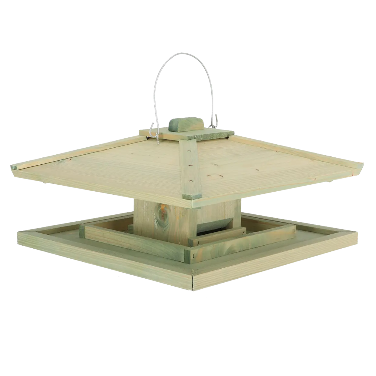 Відкрита конструкція дозволяє птахам зручно підлітати з різних боків і сідати на лоток для корму. Завдяки центральному силосу корм подається поступово, що забезпечує достатній запас на цілий день без постійного досипання. Великий дах захищає зерно від дощу та снігу, зберігаючи його сухим.