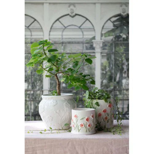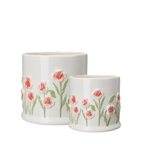 Елегантне кашпо з об’ємним квітковим декором стане ніжним акцентом у вашому інтер’єрі. Рельєфні маки з делікатними рожево-червоними пелюстками на білому фоні створюють відчуття весни та легкості, а глянцева поверхня додає виробу вишуканості.