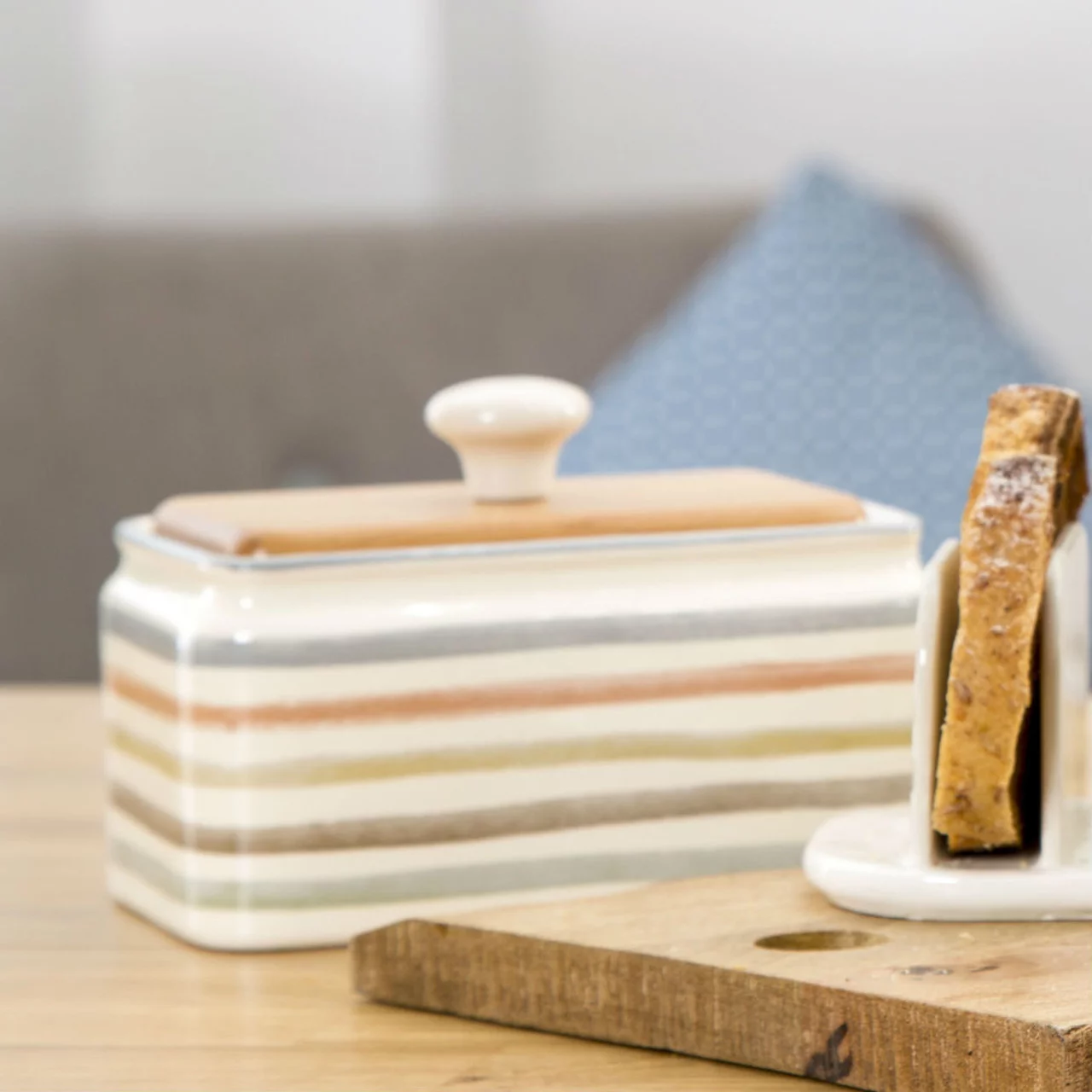 Красива, колекційна та практична, ця керамічна маслянка є ідеальним вирішенням проблеми : як намазати масло прямо з холодильника. Чарівний предмет із класичної колекції прикрашений ніжною кремовою фарбою та м’якими приглушеними смугами. Це означає, що він чудово поєднується з будь-яким декором і з іншими предметами класичної колекції. Завдяки своїй щільній кришці з букового дерева маслянка підтримує потрібну температуру масла для легкого розподілу. Міцна конструкція робить його ідеальним для щоденного використання.