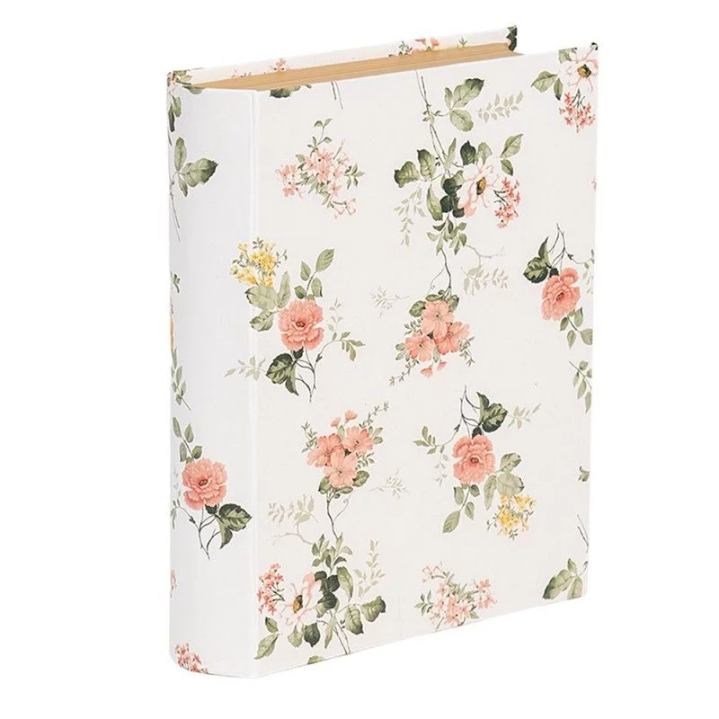 Декоративна коробка у формі книги з білим фоном і ніжним квітковим принтом — елегантний аксесуар для вашого дому. Вона поєднує практичність і стиль, дозволяючи зберігати дрібні речі, документи чи прикраси, водночас прикрашаючи інтер’єр. Завдяки своєму витонченому дизайну ця коробка чудово виглядатиме на полиці, комоді чи журнальному столику, створюючи затишок і гармонію у вашому просторі.