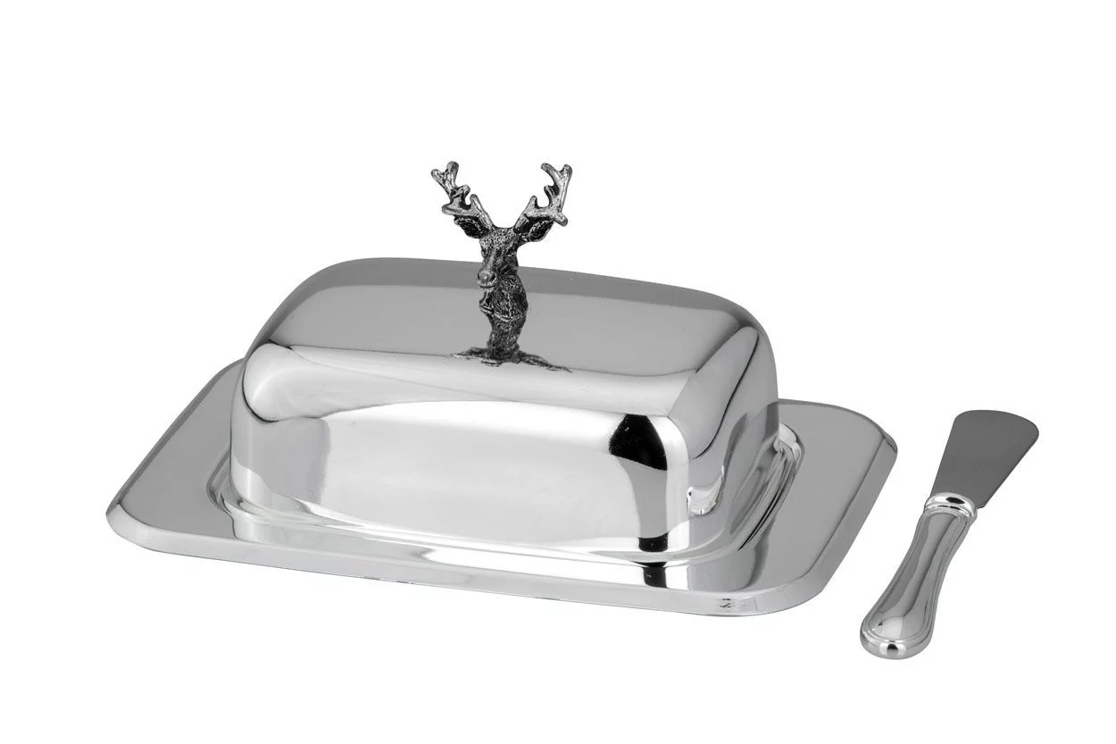 Вишукана срібляста маслянка з ефектною фігуркою оленя стане яскравою деталлю сервірування сніданку чи святкового столу. Завдяки збільшеному розміру підходить для половинки стандартної пачки масла, а скляна вставка забезпечує гігієнічність та легке очищення. Ніж у комплекті додає зручності в користуванні.