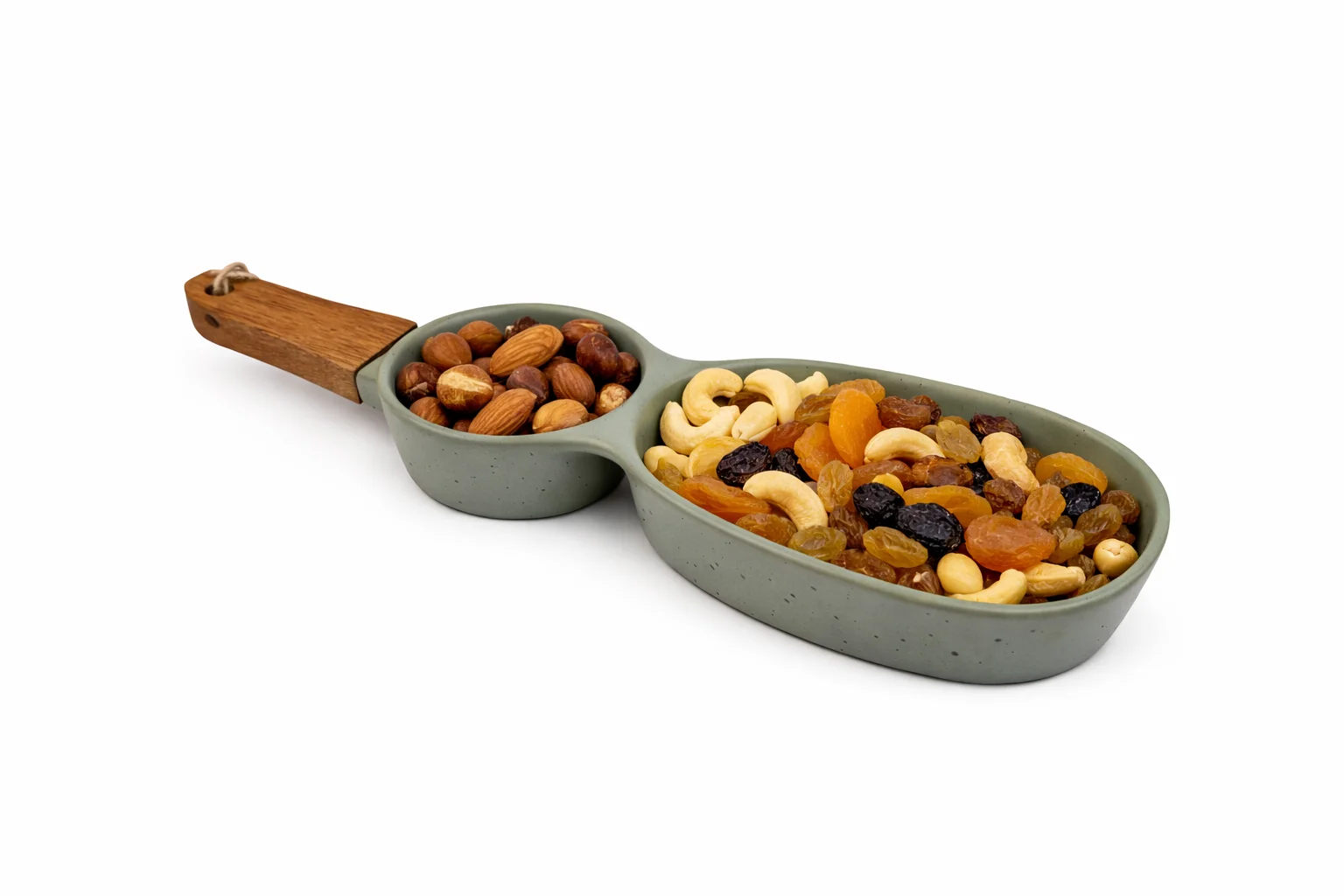 Стильна менажниця з двома відділеннями — ідеальний варіант для подачі горіхів, сухофруктів, снеків або соусів. Завдяки поділу на секції ви можете красиво поєднувати різні закуски, не змішуючи їх між собою.