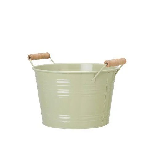 Металеве кашпо ARIELLA у м’якому зеленому відтінку — практичне та стильне рішення для дому, тераси або балкона. Лаконічна форма з декоративними горизонтальними лініями доповнена зручними ручками з дерев’яними вставками, що додає виробу затишного характеру.