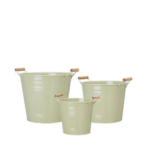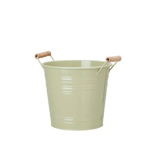 Металеве кашпо ARIELLA у ніжному зеленому відтінку — стильне рішення для оформлення тераси, балкона або інтер’єру. Лаконічна конічна форма доповнена декоративними горизонтальними лініями та ручками з дерев’яними вставками, що додає виробу затишного, скандинавського характеру.