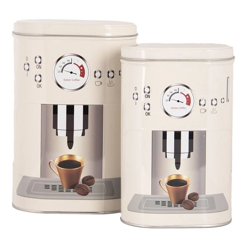 Набір стильних металевих банок у бежевому кольорі з оригінальним принтом у вигляді кавомашини стане практичним і декоративним доповненням вашої кухні. Вони ідеально підходять для зберігання кавових зерен, меленого кави, капсул чи кавових подушечок, зберігаючи їх свіжість та аромат.