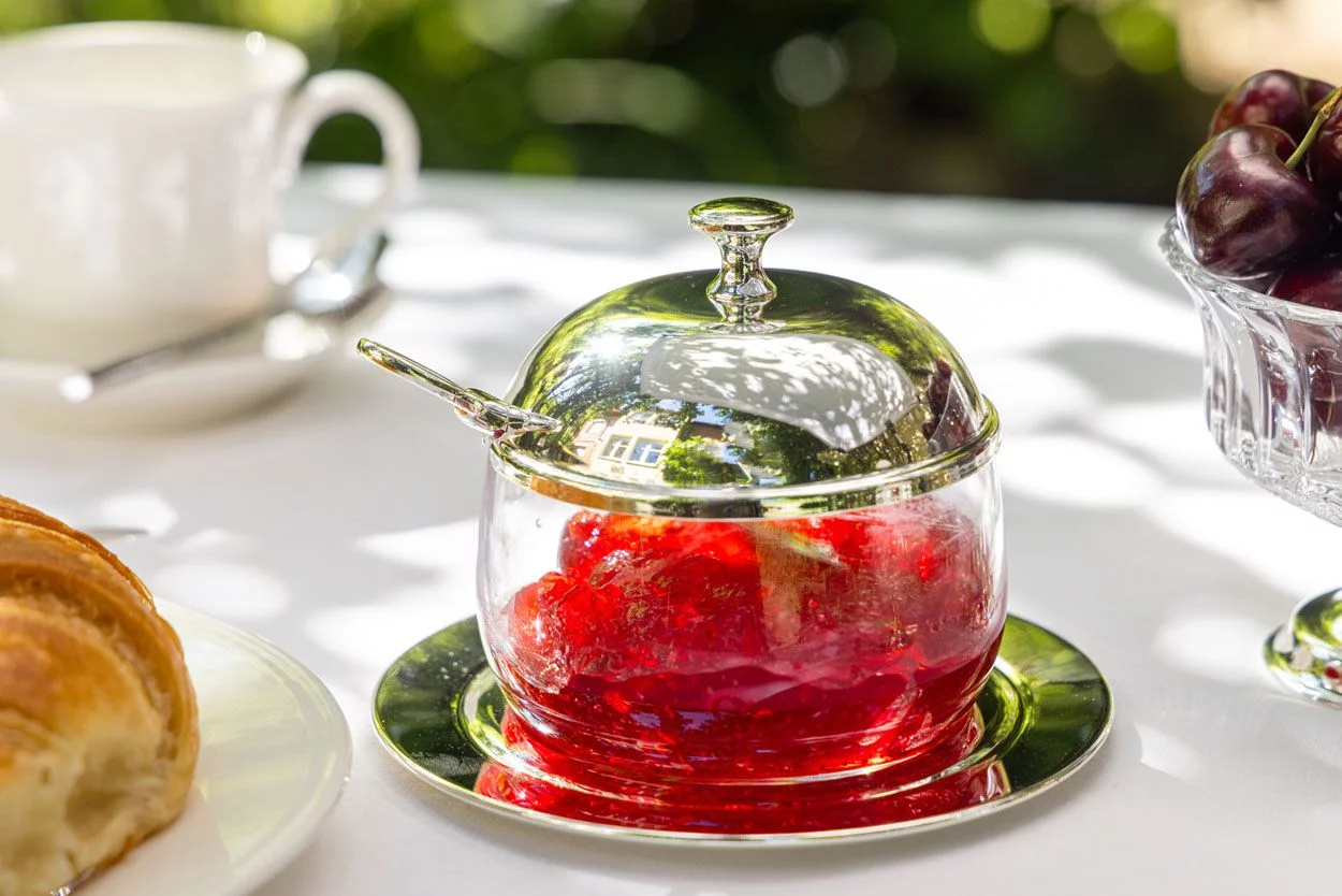 Стильний набір для подачі варення або меду, що поєднує практичність і вишуканий дизайн. Скляна ємність зі знімною кришкою та ложечкою доповнена підставкою зі срібним покриттям, завдяки чому набір виглядає елегантно на будь-якому столі.