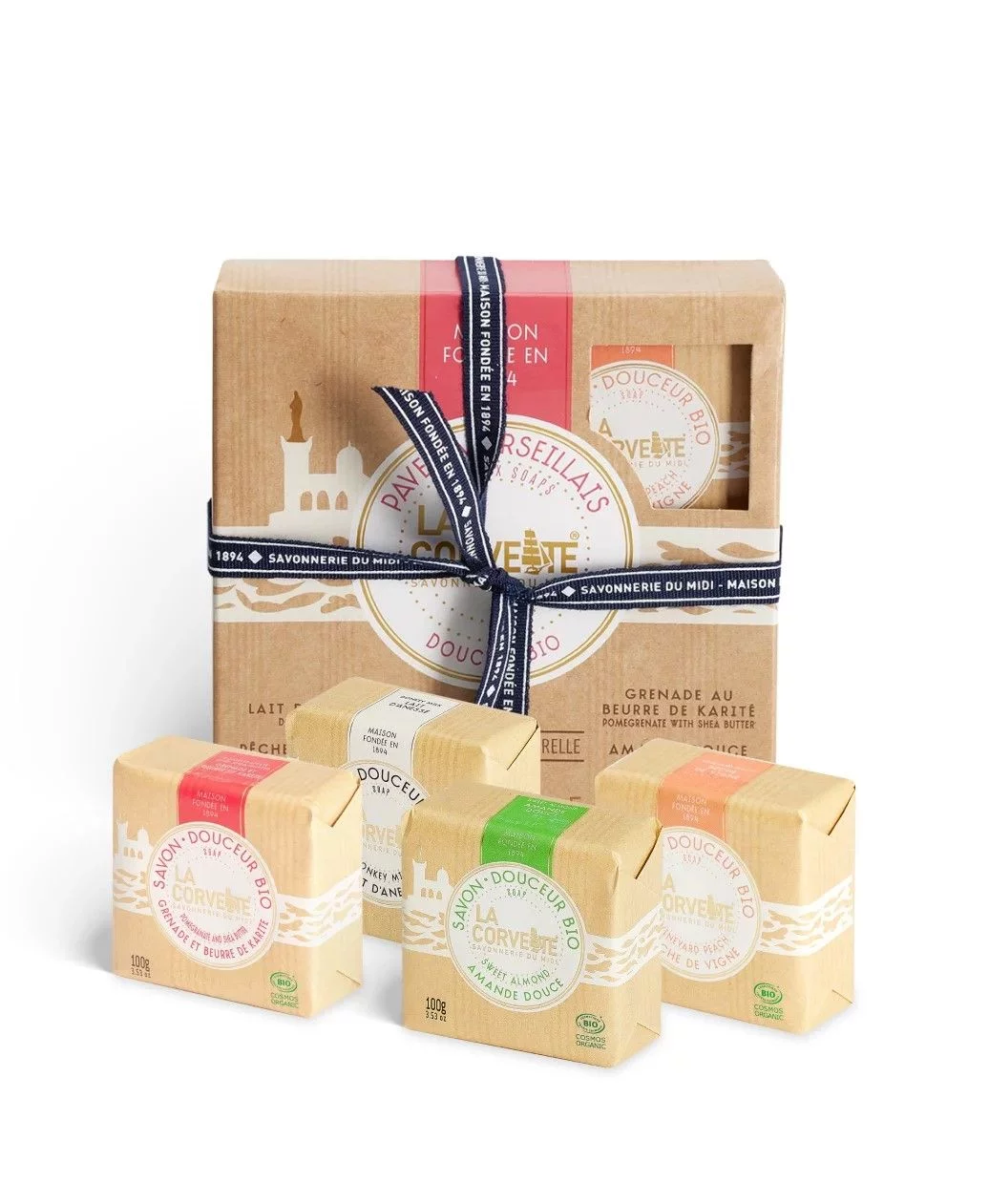 Набір з чотирьох 100-грамових мил, що мають різні аромати. Мило виготовлене з натуральних інгредієнтів, корисних для шкіри та не шкідливих для навколишньго природного середовища.