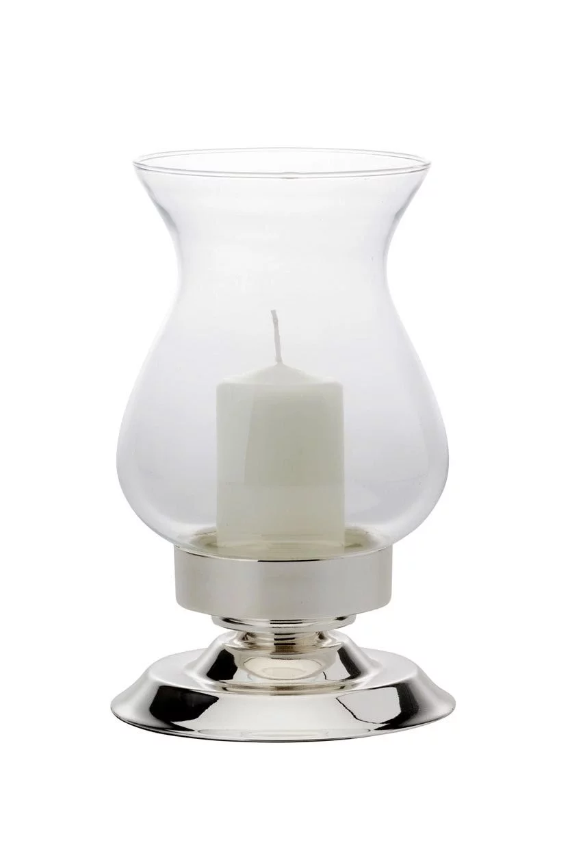 Стильний та універсальний підсвічник-ліхтар з прозорим скляним плафоном і посрібленою базою. Він м’яко розсіює світло, створюючи атмосферу затишку та спокою — ідеально для ресторанної сервіровки, декору дому чи святкових композицій.