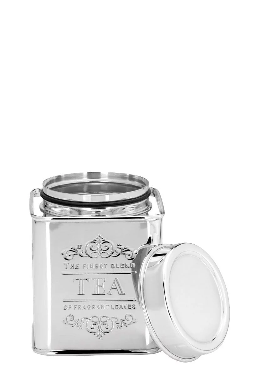 Квадратна банка для чаю з посрібленим покриттям та декоративним гравіюванням “TEA – Finest Blend”.