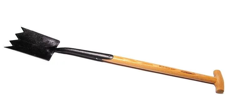 Професійний садовий інструмент із міцним зубчастим лезом, який нагадує форму «акулиного зуба». Завдяки такій конструкції він ідеально підходить для копання в щільному ґрунті, подрібнення дерну та видалення бур’янів із корінням. Загартована сталь витримує високі навантаження, а ясеновий Т-подібний держак забезпечує зручність і надійний контроль під час роботи.