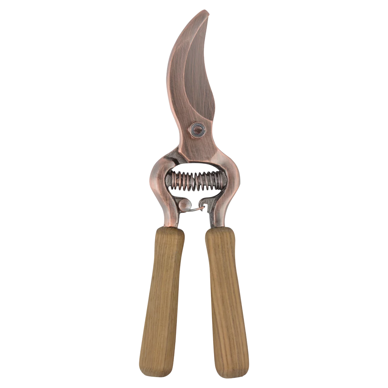 Цей традиційний садовий інструмент із вуглецевої сталі, оздоблений декоративною мідною пластиною, є ідеальним подарунком для тих, хто любить працювати в саду. Цей міцний і довговічний секатор ідеально підходить для обрізки бутонів і квітів або як допоміжний засіб при зборі плодів.