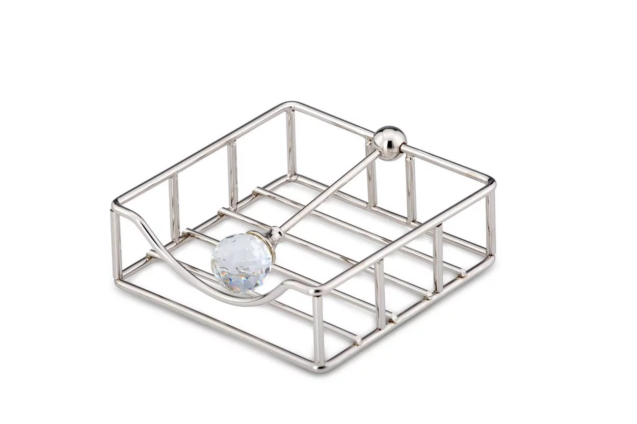 Стильна квадратна серветниця стане витонченою прикрасою вашого столу та зручним аксесуаром для щоденного використання. Виконана з нікельованого металу, вона поєднує сучасний дизайн та практичність. Родзинка моделі — декоративна кришталева деталь, яка додає виробу елегантності та розкішного вигляду.