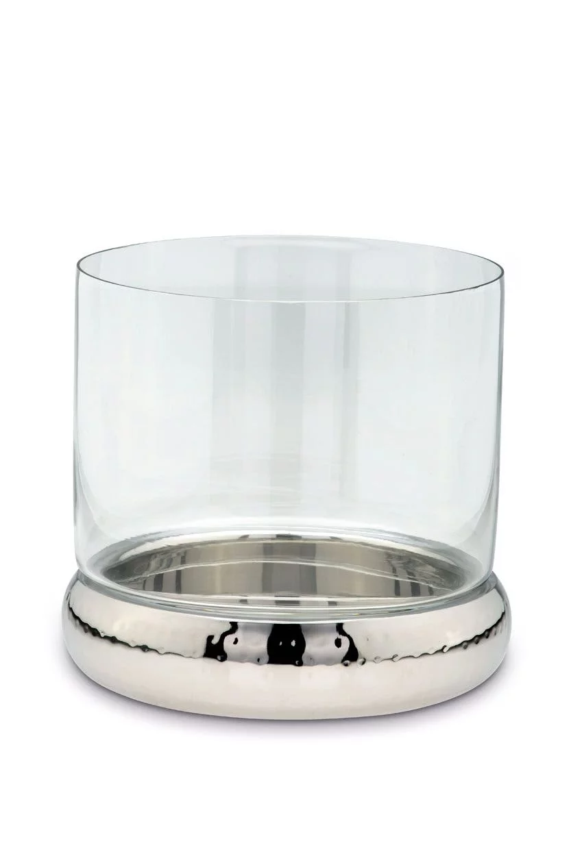 Стильний ліхтар-підсвічник з ударною (hammered) текстурою основи — акцентний елемент, що приносить у простір сучасний блиск та об’єм. Прозоре циліндричне скло делікатно посилює сяйво свічки й захищає полум’я від протягів.