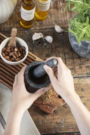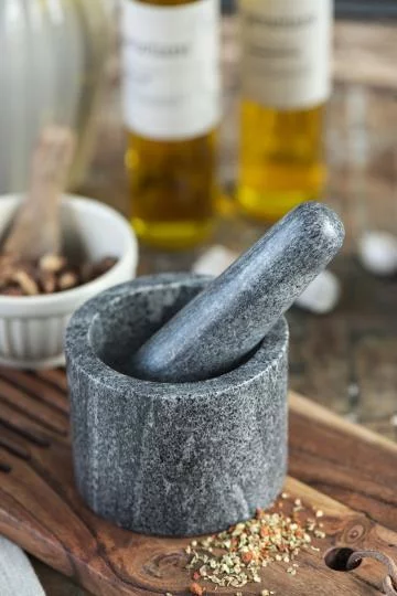 Ступка з каменю є бажаним аксесуаром на кухні.Камінь важкий та завжди холодний,добре подрібнює трави,приправи,мак,тощо.Не порушує смакових властивостей продукту.Дуже добре піддається обробці після використання та не вбирає запахів.